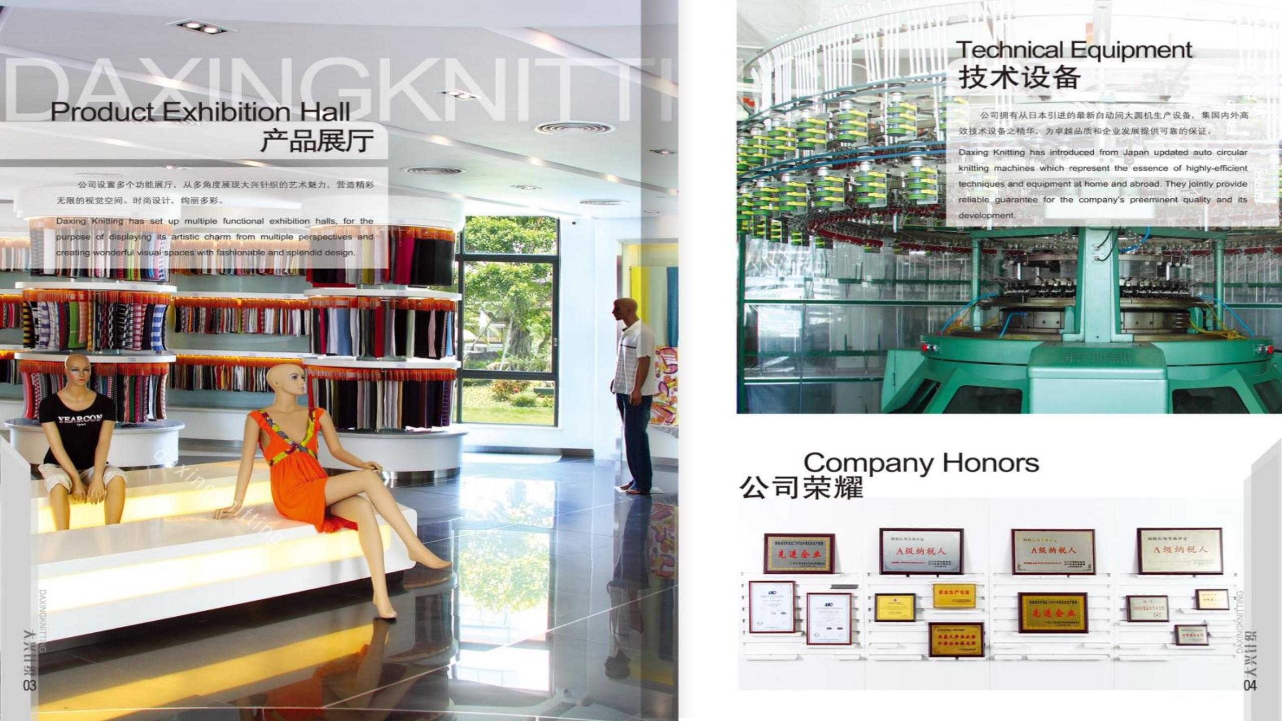 公司的园林式厂区环境优雅、舒适,占地面积约30000平方米。拥有各类大圆机设备150余台,员工约200人,年产能8000余吨。其产品种类齐全,主营产品有平纹、罗纹、双面、珠地、卫衣、提花以及高针高密系列等,适用于各类运动服、休闲服、时装及内衣等。公司坚持以创新为主导,质量为根本的方针,为客户提供织、染、印的全套解决方案,为各大服饰品牌提供优质的产品和服务。
